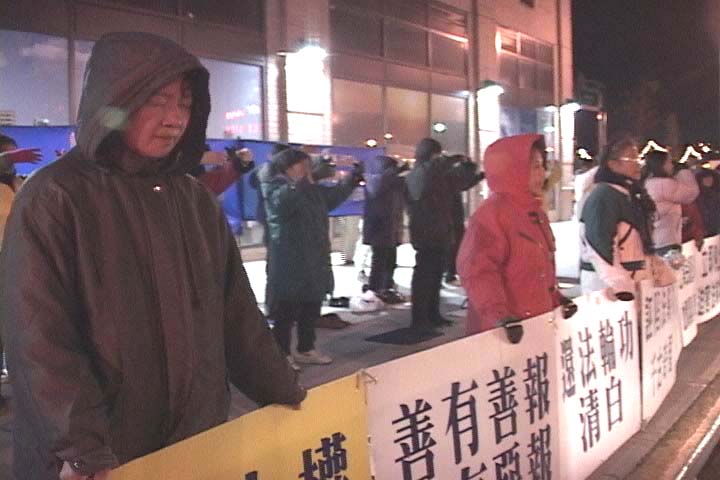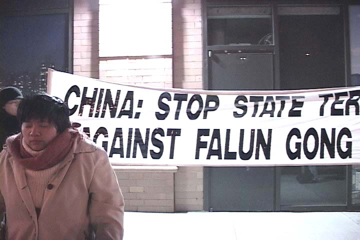 来自十二个国家的36名西人法轮功学员,自发地到天安门广场打坐、举大法横幅,向中国政府请愿,要求还法轮大法以清白。这是海外法轮功学员的大善之举。他们以自己的至诚至善之心告诉中国人民:“法轮大法好!”“真、善、忍是宇宙的最高法则!”他们完全是为了中国人民的利益。但是,他们立即遭到了中国警察的暴力拘捕。为此,纽约地区一百多名法轮功学员从今天下午5点开始,冒着凛冽的寒风,在纽约中国总领事馆前炼功、发正念请愿,对36名西人学员表示声援,强烈要求中国政府立即释放这些被无理拘捕的西人学员。