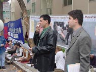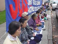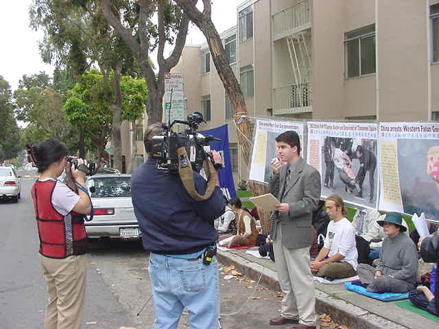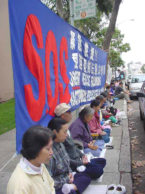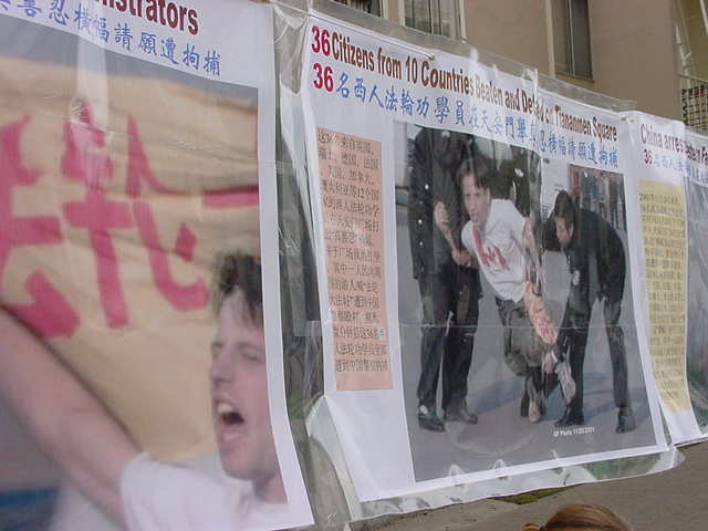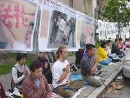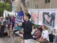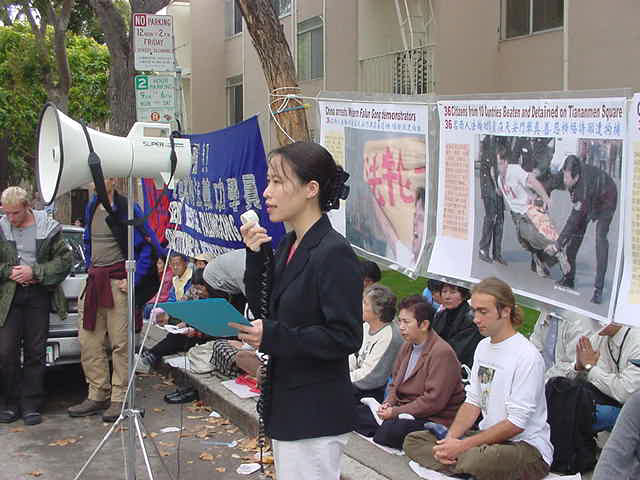 【明慧网2001年11月22日】约120名旧金山湾区的法轮功学员于美西时间11月20日下午1点在旧金山中国领事馆前集会,抗议江泽民政府今天早些时候在天安门广场逮捕关押和平表达意见的西方法轮功学员的野蛮行径。学员们发正念铲除邪恶,并用中英文宣读了被抓西人学员的声明,要求释放被关押的学员,并且保证他们安全返回。现在已被证实的被关押学员中有两名加州学员。在领事馆前排队的人很多,他们都在静静地听着学员通过麦克风向他们讲述这次活动的原因及学员修炼法轮功的亲身体会和善恶有报的小故事。