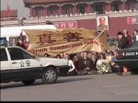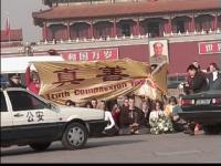 面对和平安祥的西人法轮功学员,中国警察没敢象对待中国人那样拳打脚踢,也知道不该把西方人当成自己练拳脚泄私愤的工具,但他们太习惯于使用暴力和欺侮他人了。上图是那面写着“真善忍”三个大字的横幅遭警察撕扯的一瞬间情景。