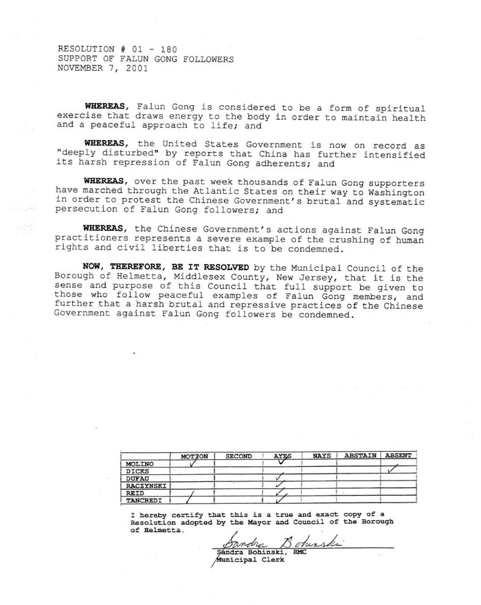 【明慧网2001年11月23日】新泽西州海尔麦德市2001年11月7日通过决议谴责中国迫害法轮功学员,决议内容译文如下: