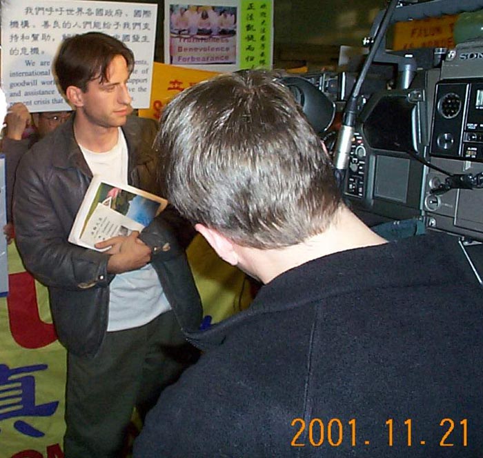 “在修炼法轮功以前,我常常考虑的自己,但现在我想到的更多的是别人……在发生这一切的过程中,我在天安门广场很祥和,因为我们展示给世人的是“真善忍”。我们在广场上打坐时开始没有动静,但很快警察和警车冲了过来,这时我展开一面横幅上面写着“法轮大法好”,与此同时我从人群中跑出来,并用中文向人们喊道,“全世界都知道法轮功是好的,美国人知道,加拿大人也知道。”