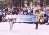 上午游行九点开始,约有六十一个团体参加,其中绝大部分是大公司;走在最前面的是警察骑马开道,市长候选人桑切斯坐在消防汽车上,以及欢乐队,接着是主办单位─华盛顿联合基金,紧接着是大乐队;后面竟然没有队伍,这时突然出现一个非常惊喜而戏剧性的场面:两位大法弟子身着“真、善、忍”的黄色套装,手持写有“法轮大法─真、善、忍”的大横幅,出现在游行队伍中,她们昂首挺胸,跟随乐队,踏着乐队的曲奏向前迈进,沿途获得市民们的鼓掌和喝彩;有些市民惊喜地用中文对大法弟子欢呼“你好。”