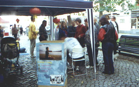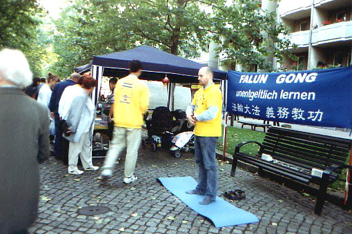 有一位骑自行车的年轻男士认真看完我们的展板后在征签表上签上了自己的名字并拿了份报纸走了。一会儿,他又特意返回来又向我们要了一份报纸带给他的朋友。在我们的“免费教功”的横幅前,许多人当场就跟我们学习的五套功法。有两个小男孩竟然把五套功法从头做到了尾。