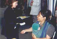 我们的展位前一直排着一个长长的队等着索取写有“真,善,忍”的书签。两位来自波兰的年轻姑娘一下要走了五张书签,当我告诉她《转法轮》也有波兰文版及相关的网址时,她们非常高兴。我真心地祝愿她们有缘得法。