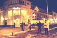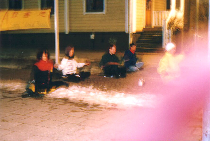 。中途在欧蓝岛停船三小时,虽然是清晨六点半,北欧的天气仍然很黑。但学员们珍惜此机会,迅速赶到欧蓝岛市中心,展开横幅开始炼功。因为时间太早,过往行人并不太多。但是在这短短的时间里却不约而同地来了两名当地新闻报记者,当我问起他们是如何得知此消息时他们说:“我的家就住在广场边的楼上,我看到你们了!”他们认真的进行了采访,并拍摄了许多照片,此消息将在明日欧蓝新闻报报道。在返回船上的途中学员们把手中剩余材料发到了岛上的家家户户。