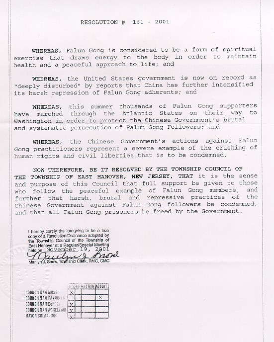 为此,新泽西州东汉诺威市(East Hanover, NJ)市议会决定:本议会全力支持那些以平和的法轮功学员为榜样的人们,谴责中国(江泽民)政府对法轮功学员的残酷迫害和镇压,呼吁中国(江泽民)政府释放所有被监禁的法轮功学员。