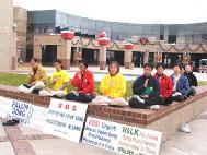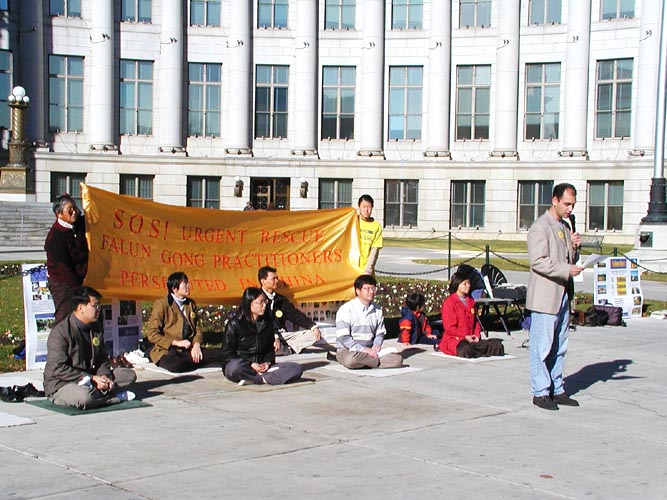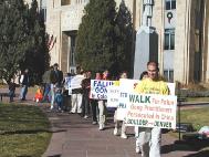 步行的那天,十一月十七日一早,大家就聚集在波德尔市中心的广场上。在这里,我们举行了“紧急救援步行”的新闻发布会。十点多钟,弟子们在悠扬的大法音乐伴随下,展示了五套功法。有两家报社(“科罗拉多州每日新闻”和”每日新闻图片”)的记者对我们进行了采访和摄影。等新闻发布会一结束,我们就戴着大法标语牌,排着整齐的队伍,踏上了“紧急救援步行”的征途。