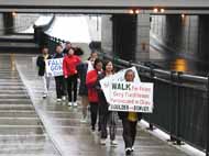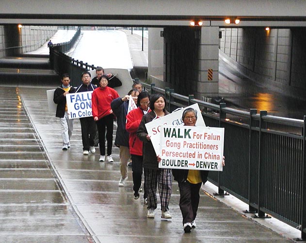 雨继续下着,我们的决心和步伐却丝毫没有因为它而减缓。当许多开车的人看到我们举的标语牌时,被我们雨中步行的举动和决心所感动,纷纷鸣笛致敬。有位七十多岁的女弟子和另一位从头一直走到底的弟子不顾疲劳,也挥手致谢,感到这是大法的威力使世人觉醒了。第二天的步行在四点钟于丹佛十六街购物中心结束。