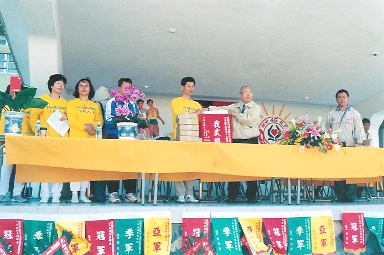 值得一提的是,校长本来不了解大法是什么,也不了解大法为何会受到迫害。学员在表演中向其讲清真相。他本来还有疑惑,但在看完我们的表演后,对我们赞扬与认同,并致词说:「炼法轮功的人都是好人」。另外在准备过程中,他们还答应给我们的几项便利条件,使得整个功法表演过程中不受干扰。例如,提供活动中心让我们整队。还可以在教室外面展示大法看板。更重要的是示范功法时不会同时进行其他比赛活动。使整个功法表演都能在庄严宁静的气氛下进行。