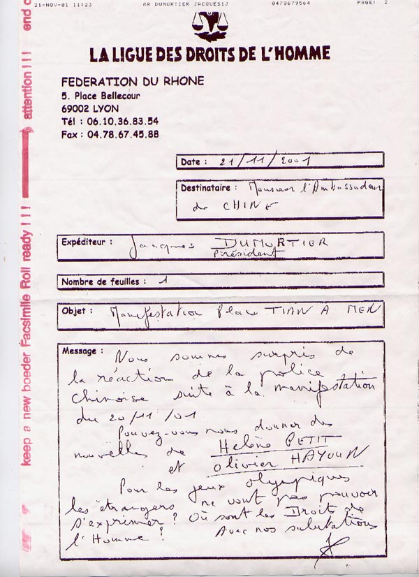 发件人:雅克·杜摩铁(Jacques DUMORTIR),人权联盟罗纳省(Rhone)联合会主席
