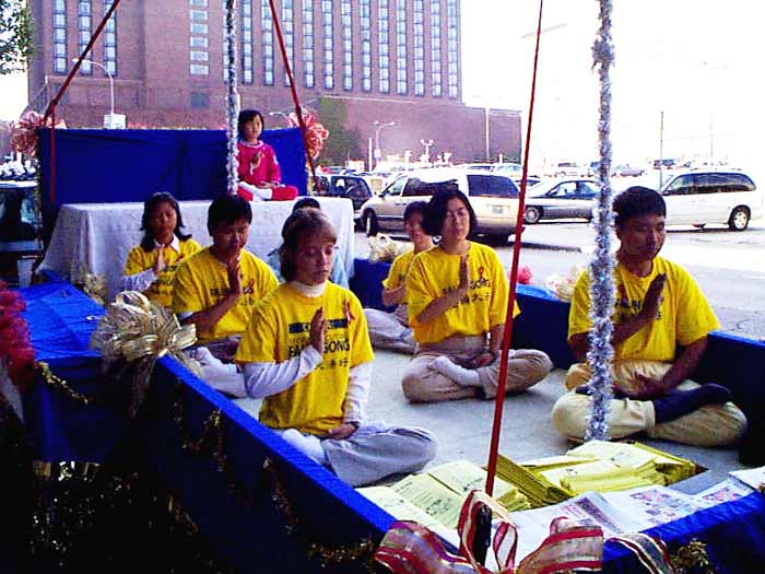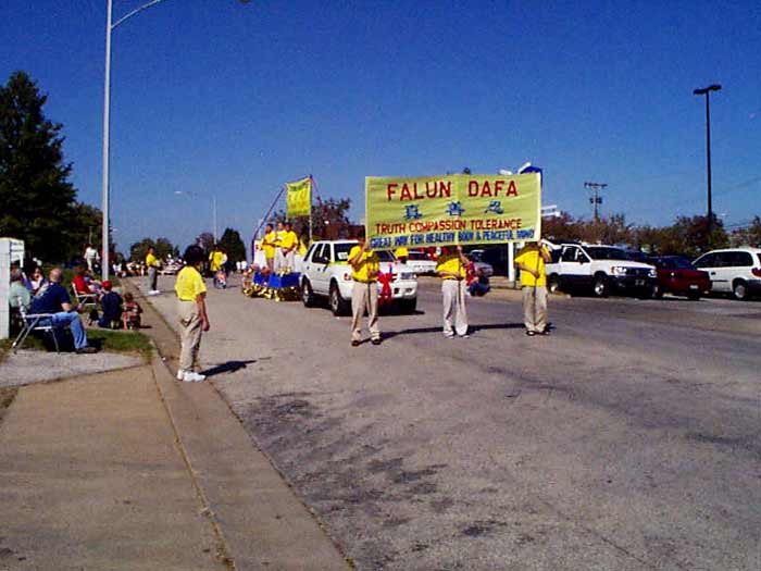 这一天,天气格外晴朗,秋高气爽。当我们随着游行的队伍缓缓前行时,“法轮大法”,“真、善、忍”的大型横幅在阳光下发出耀眼的光芒。两边观阅的人群频频向学员们招手致意,观众们争相传阅学员们派发的大法资料,不时可见纯真的孩子们向我们合十敬礼,一切尽在“缘”中。当队伍进入观阅台,广播中宣布现在步入的是法轮大法的队伍时,人群中报以热烈的掌声。