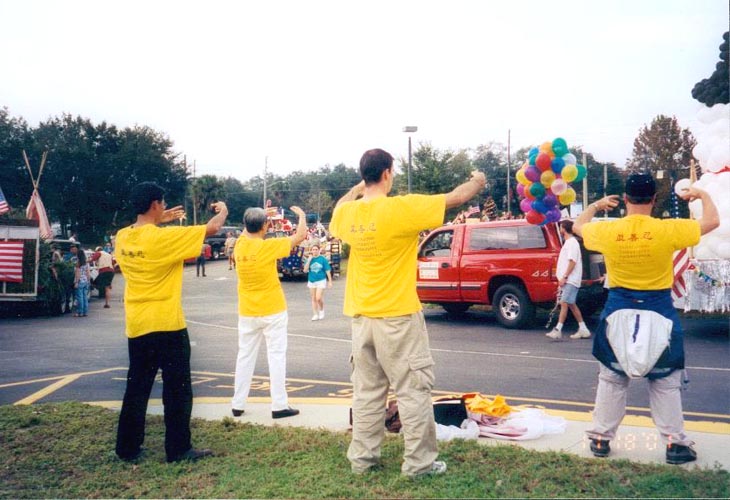 最后,资料发完了,弟子们就在游行队伍中回答人们的提问,当队伍停下来等待时,我们就立刻演示一套功法。当游行结束我们往回走时,不停地有人和我们招手,一位西人女士走过来说她没拿到简介,弟子在口袋里又找到一份给了她,她高兴的走了。