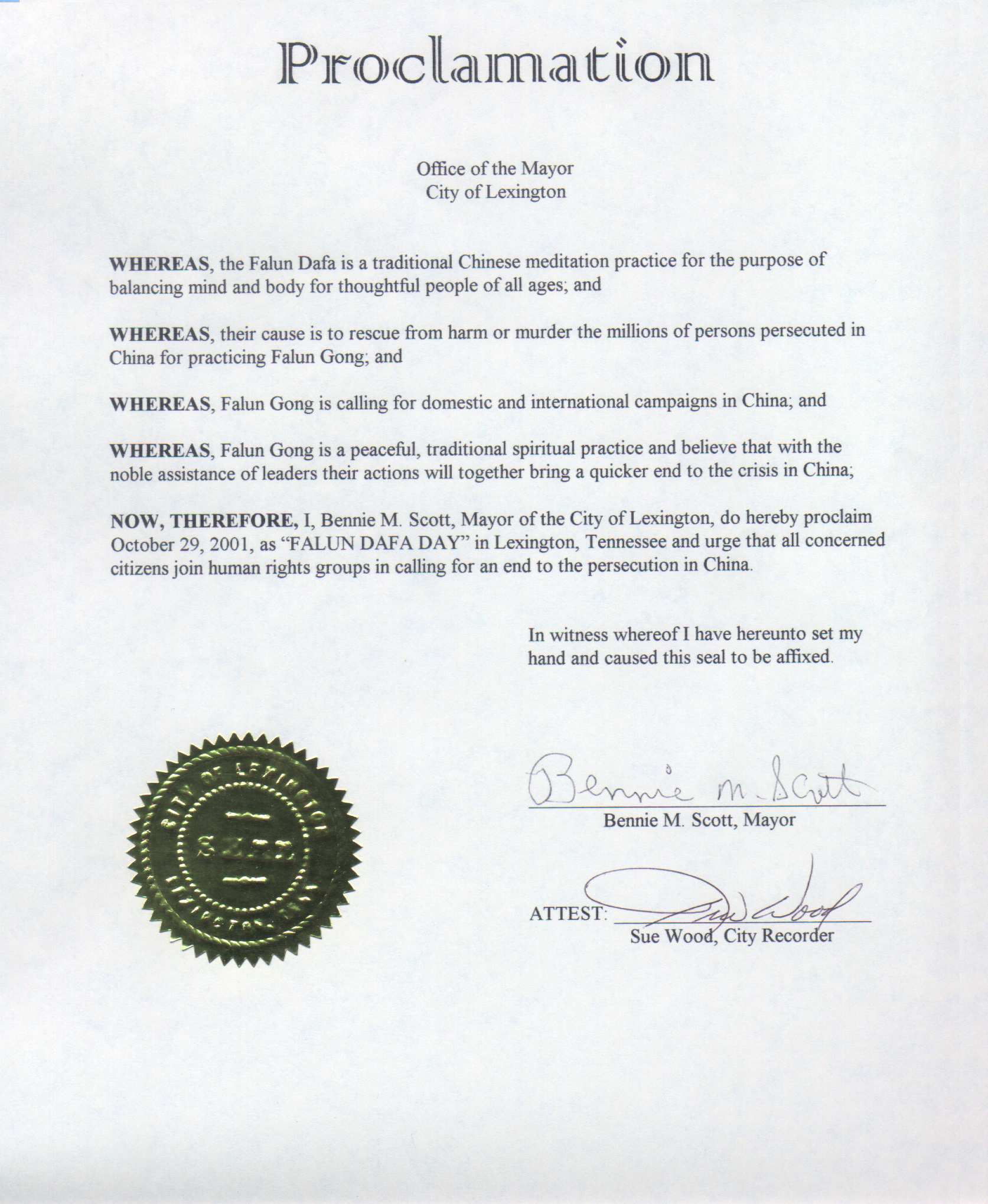 【明慧网2001年11月4日】田纳西州莱克星敦市市长本宁.斯考特宣布2001年10月29日为田纳西州莱克星敦市的“法轮大法日”。