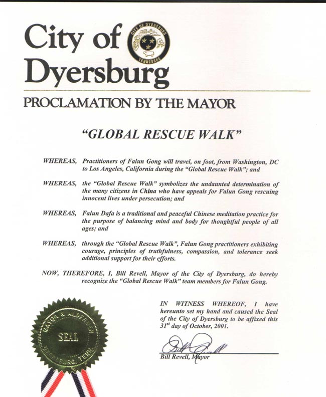 【明慧网2001年11月4日】田纳西州戴斯堡市市长比尔.瑞文2001年10月25日签发褒奖状褒奖“紧急救援全球步行”小组的全体成员。