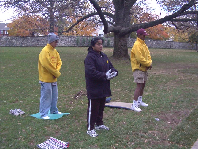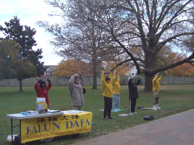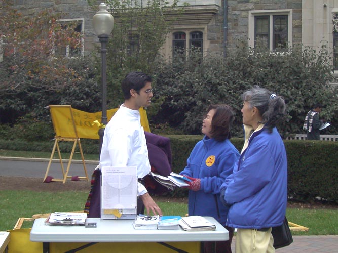 来自中国大陆的一名年轻学生在聚精会神的看着我们炼功,我走上前和他交谈。在镇压法轮功之前他从来没有听说过法轮功。中国镇压法轮功后,在大陆从广播和电视里他听了许多中国政府编造的谎言。他说:“我是学科学的,我相信任何事物都有两方面。我想了解一下为什么有那么多的人学炼法轮功,炼法轮功的益处到底是什么?可是在中国铺天盖地的都是批判法轮功的书,我很高兴现在我在美国了, 我可以了解了解有关法轮功的真实情况了。”他带走了各种中文大法材料,我又给了他我的名片以保持联系。