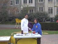 布置好带来的摆放弘法传单,真象小册子和图片集的折叠桌后,有的学员炼功,有的学员派发传单。麦可讲着一口流利的北京话和我们打招呼,他曾在中国留学一年,如果不看见他金发碧眼的模样,我们真的以为他是北京人哪!麦克是学国际关系的,和我们用中文交谈了近半个小时关于法轮功及法轮功在中国被镇压的情况,中英文的大法材料他每样带走一份,他说他将专门研究研究有关法轮功在中国被迫害的课题。