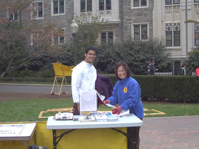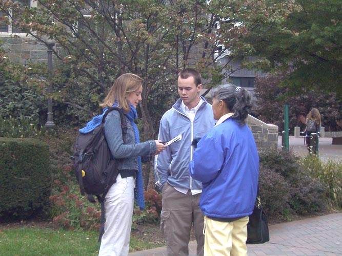 乔治城大学校园古朴典雅,校园正门雕像旁的栏杆上中英文的"法轮大法─真善忍"的大横幅为这所著名的学府增添了几分神韵。乔治城大学学风严谨,学生及教职员工思想开放,过往的学生,教授及游客们高兴的接过我们的传单并感谢我们在乔治城大学校园组织的这次讲清真象活动。