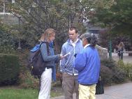 中午12时我们刚刚挂好大法横幅,支起大展板,一群大学生走过来。一个叫克瑞思 (Chris) 的学生指着我们的展板告诉他的同学:他亲眼目睹了中国警察在天安门广场毒打法轮大法学员。他说:“我是在天安门广场上了解法轮功的。作为交换学生我在中国学习一年,我和我的美国朋友在天安门广场旅游拍照时,我们看见法轮功学员在天安门广场静静的举起横幅,中国警察看见就拳打脚踢,将法轮功学员拖进警车带去公安局。我的两个美国朋友拍摄了警察打人的照片,照片的底片被没收,警察还无理的拘留了他们。”