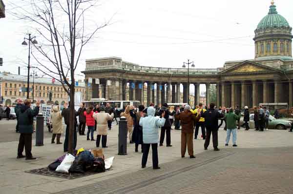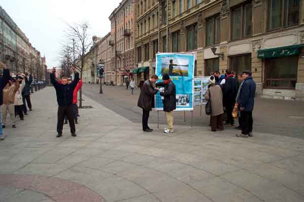 象以往一样,弟子们聚集在圣彼得堡最繁华的街道──涅瓦大街上,这是城里最美丽的地方之一,从古至今都闻名遐迩,热闹非凡的街道。在这里,人们总能看到身穿写着“法轮大法─真善忍”及“SOS”字样的黄色服装的大法弟子们在美妙的音乐伴奏下整齐而优美的炼功场面。每周六休息日来到这里向城市居民和旅游者们提供机会了解大法真相,对圣彼得堡的很多大法弟子来讲已经成了惯例。