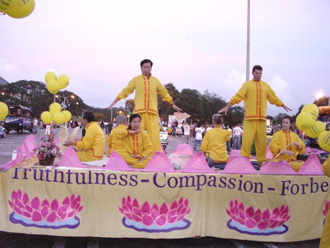 11月2日,在Tampa(坦帕)市的南佛州大学举行了一年一度的校友会彩车游行。几十台各式各样的彩车鱼贯而行。当地的法轮功学员参加了这次游行。游行开始之前,乌云滚滚,大雨降临。学员们全体发正念。不一会儿,雨过天晴。法轮功的彩车异彩飞扬,得到了观众的好评。