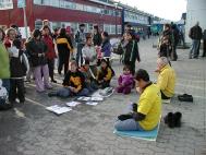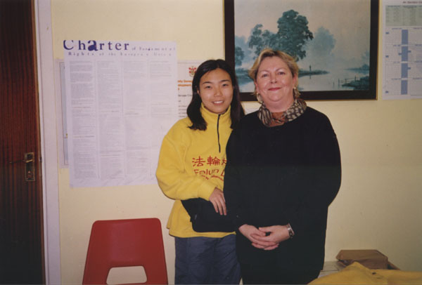 不一会儿,我们已经被人们团团围住,人们好奇地纷纷拿资料,读了起来。有一个女孩,她指着 SOS传单上赵明的照片问道:“他现在还在监狱里吗?”我不禁为她看似偶然却并不偶然的问题心中一震。她得到了肯定的答复。我们告诉她,现在整个欧洲,有许多善良的人们,在为了解救赵明,这位善良而坚定的修炼者,而奔走呼吁。接着,人们开始自动传递征签本,一个一个地签名。无需多解释,无需讲什么,人们敞开真诚的心扉是最容易与“真,善,忍”沟通的。这是我感到最轻松的一次洪法了,我们仍然在继续炼功,可是签名却以飞快的速度进行着。虽然我们只带了一本征签本,在短短的一个半小时中,签名的人数是140多,不到一分钟一个!这个速度在我们以后的几天街头洪法时,从来没有掉下来过,无论是天气好时,还是气候比较寒冷时。