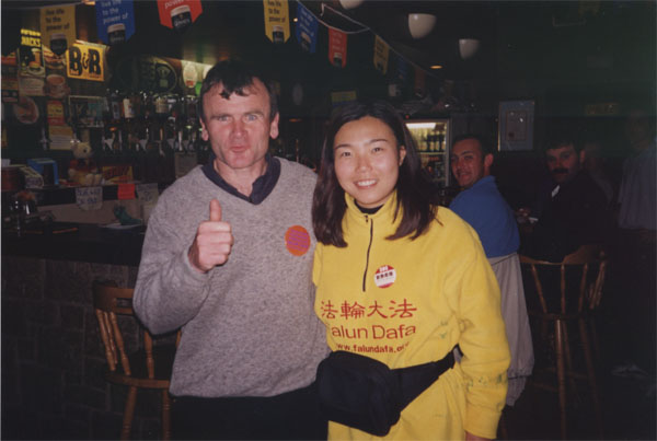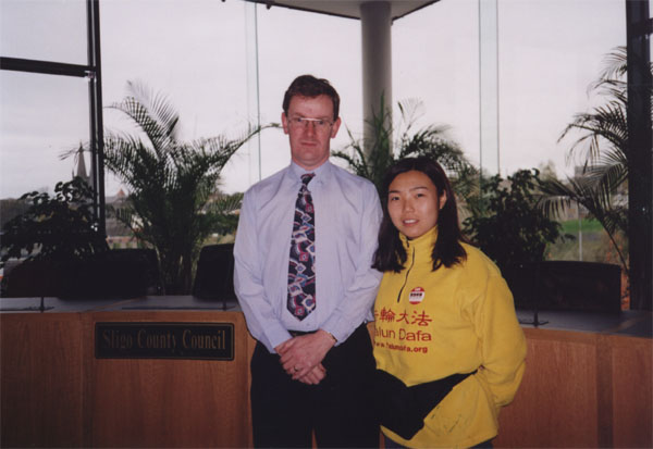 在到达下一个镇子的近两个小时的行程中,我们的裤子全都湿透了,一把雨伞被狂风折磨的全然没了伞样。而且这段路是一段山路,不断地爬坡不说,还十分泥泞。在终于到达了今天的第一个目的地后,我们的辛苦没有白搭,我们见到了正在家里处理公务的主席帕迪.凯利(Paddy Kelly)先生。见到我们后,他还特意换上了非常正式的衣服与我们合影。听完陈述后,他当即表示要把我们给他们的真相材料复印并传给他下面的各级政府长官。他对我们表示非常的同情和支持,并且,他表示希望能和我们保持联系,将来如果我们在都柏林有活动,他也表示非常愿意参加并发表讲话。与此同时,这位主席让他的儿子帮我们联系了几家媒体,他们都非常感兴趣。主席的儿子说他会把我们给他的真相材料传真给那些媒体,其中有一个电台表示希望对我们进行电话采访。对能有这样的理解和支持,在风雨中已湿透了的我们此时并不觉得那么冷了!临别时,主席的儿子特别送了我们一把结实的大伞。这真是一份非常实用的礼物,我们正需要它!