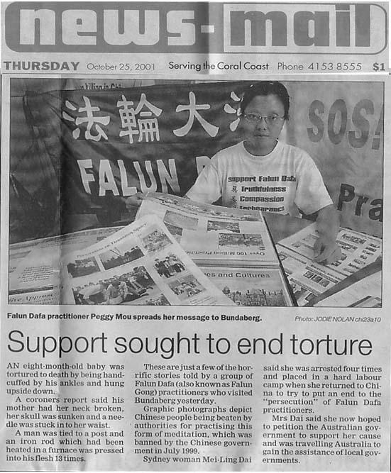 学员们当时正在面对一个丁字路口打坐,街上很多行人观看并索要资料。格兰.白兰女士告诉我们:她本来对法轮功一无所知,是她的女儿告诉了她一切。她非常关切地寻问了很多问题,认真地听取学员的介绍,并亲眼看到了中国江泽民政府迫害法轮功的两个人证。她立即表态说:中国政府对法轮功的镇压是不可思议的,是失去理智的行为,并认为这样的事情讲出来,对澳洲人民是有好处的,因为在这个环境中听不到。她强调无论你来自哪一个民族都必须尊重个人的权利,交谈进行了大约50分钟。她索要了很多法轮功的资料,并说会把这个讲求“真善忍”的功法介绍给她的客人、朋友。