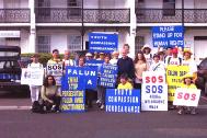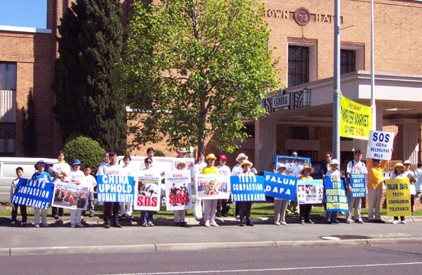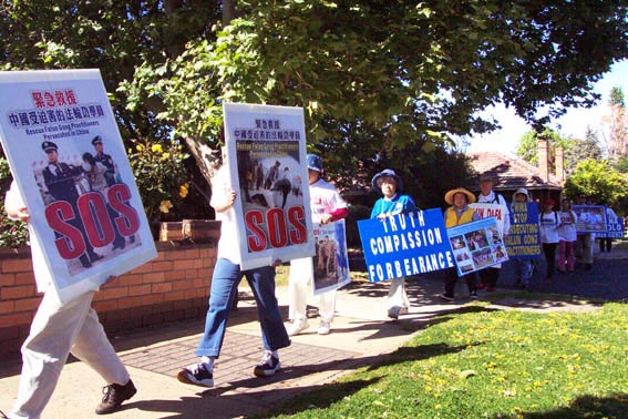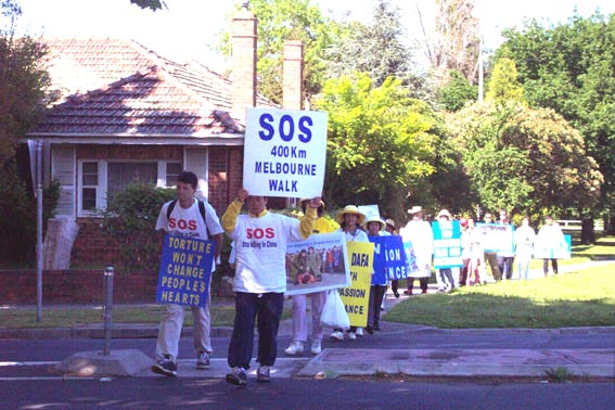 墨尔本大法弟子“SOS步行”活动是全球“SOS紧急求援”活动的一部份。这次为期六周的活动是从9月13日开始的,为了方便更多的人能够参与,“SOS步行活动”只是利用每星期的周末两天,我们从中国驻墨尔本领事馆门前出发,将走遍墨尔本市区内及周边市区的所有主要商业街,并一路发正念,从一个市政厅走到另一个市政厅,共计二十九个市政厅,一天平均行走7个小时,三十多公里,预计总行程400多公里。其目的是让更多的人了解法轮功真相,伸出他们援助的手,共同制止江泽民政府的暴行。目前行程已过半,参加的人数已有60多人,年龄最大的近70岁,最小的只有三个月。