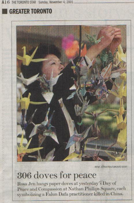 【明慧网2001年11月7日】2001年11月3日,星期六,多伦多的修炼者们在市政厅前为多伦多的社区举行了一次“和平与爱心日”活动以歌颂这些令我们的世界变得更美好的特性和价值。据市政厅工作人员说,虽然天气寒冷,仍有1000多名多伦多居民和外来的旅游者参加了欢庆节。几家主要媒体,包括多伦多星报,都对此做了很好的报导。多伦多星报的一名记者和一名摄影师在那里停留了数小时,享受着音乐节的快乐。下面的照片是修炼者们做的306只纸鸽子,每只代表了一位在中国被迫害致死的法轮大法修炼者。然后,几十只真的和平鸽飞上了天空,以纪念那些带着坚定、和平与尊严献出了生命的修炼者。