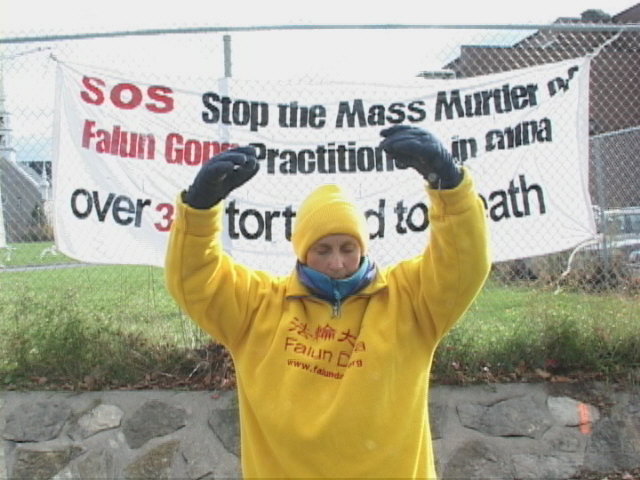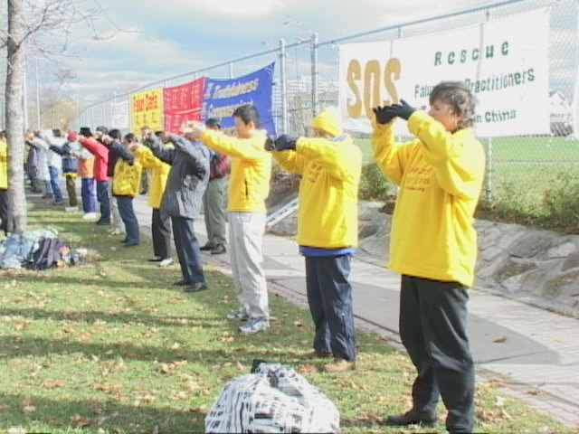 “几十名法轮功修炼者今天下午在旧金山的中国领事馆前举行抗议。同期举行的抗议活动遍及全国。抗议者们对在中国发生的对法轮功信仰者的暴力迫害不断升级表示愤慨。1999年法轮功在中国的修炼人数超过7千万人,后来被宣布为非法。法轮功不是宗教,而是通过打坐方式,目的为提高修炼者自身的一种信仰。”