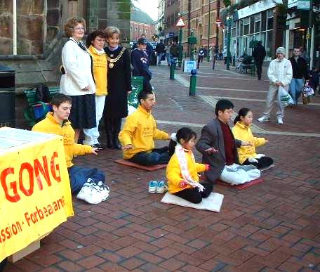 下午1时左右,达彼市女市长携助手亲临洪法街头看望大法弟子。之前,当地学员玛莉给市长写了信,详细介绍了她得法后身心受益的巨变及大法遭受中国政府残酷迫害的真相事实。市长回信表示到时一定亲临我们洪法的地方看望大家以表慰问。市长亲切地与学员们交谈并表达对法轮功学员境遇的深切关注。她还详细询问了一位学员关于她妹妹因修炼法轮功而被劳教一年的情况。市长的到来引来许多市民的注目。市长在众人的注目下与大法学员愉快地合影留念。
