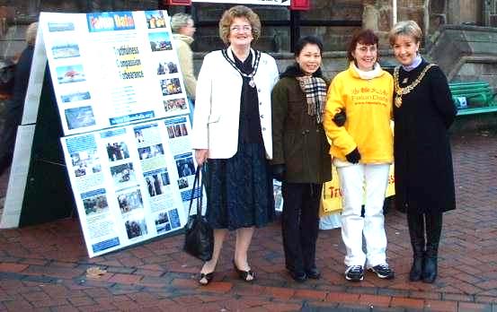 12月8日星期六上午,来自英国达彼市周边六个城市的10多名法轮功学员来到达彼市中心:圣彼德教堂大街进行洪法及揭露真相活动。这些学员中,一名70多岁的弟子和两名10岁左右的小弟子特别引人注目。一些学员在大法音乐的伴奏下重复地向路人演示祥和的功法;其它学员则在街头不同地方分发真相传单。两扇大型法轮功真相展板也吸引了许多路人的驻足。