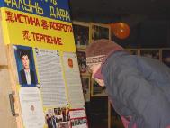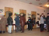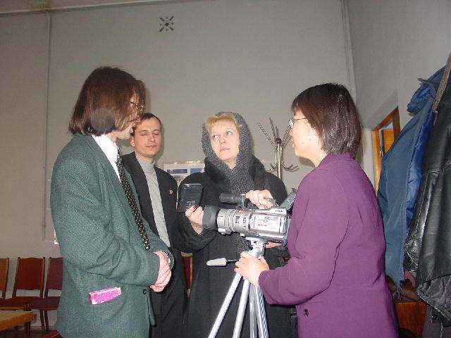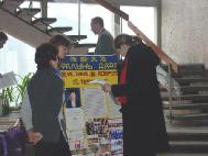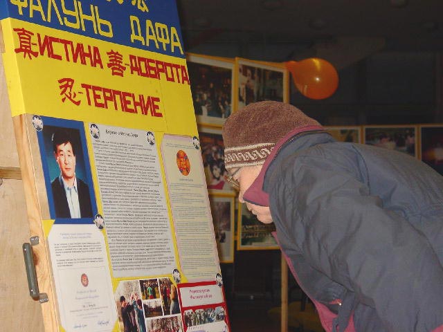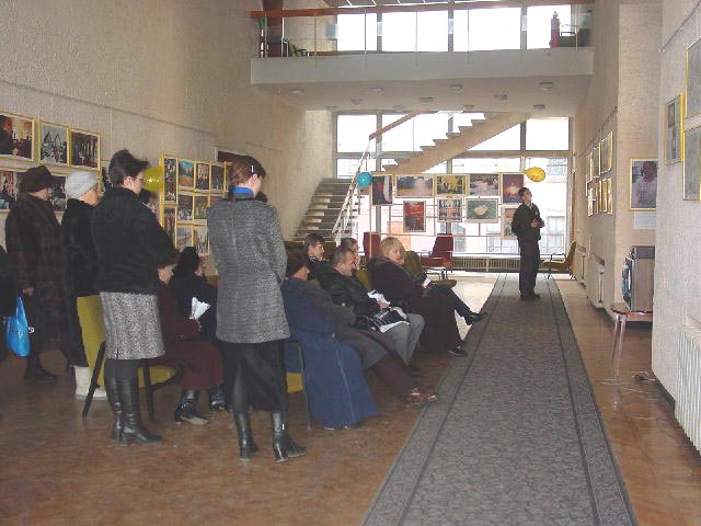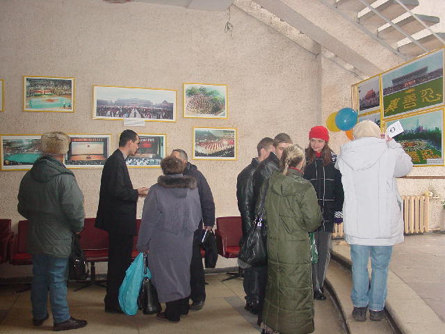 开始我们面临着很多困难,当内心的问题暴露出来,并清除了外来的干扰后,形式就发生了改变。在这三天的时间里,圣彼得堡来的学员对我们帮助很大。图片展在城里最好的展厅之一‘科学家大厦’里举办。在这座大楼里有一个网吧,很多中国大学生经常光顾这里,这是绝好的清除他们头脑里由于邪恶的谎言作祟而形成的对大法不正的观念的机会。一个中国人接连两次进来参观画展,第二天与学员谈了很长时间,然后想学炼功。学员送给他一本中文的《转法轮》。