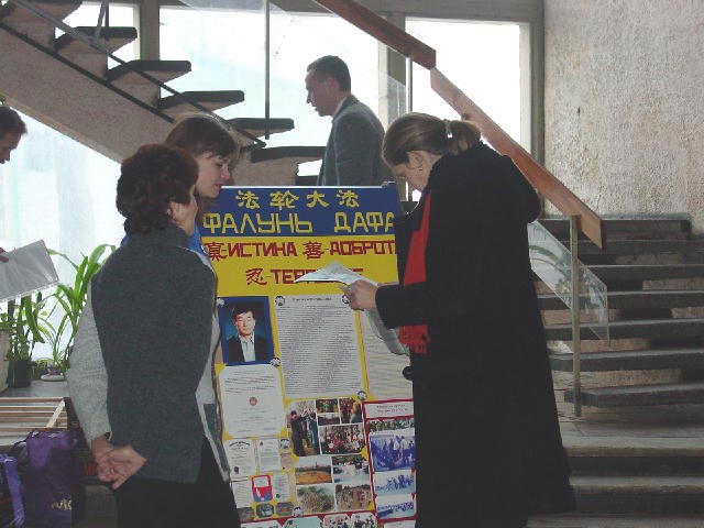 很多参观者都对图片展只举办三天表示遗憾。展厅里回荡着“普度”和“济世”的音乐,向参观的人们播放着关于法轮大法的录像片;学员们在大厅里炼功,人们认真地看着学员们整齐而舒缓的动作,还有部分学员向人们介绍着图片内容;另有一些学员在外面街上向人们发送图片展的请柬。
