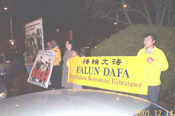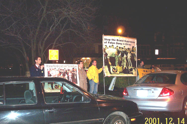 黑人,白人,黄种人,不同的民族、不同的肤色在冬日的夜晚一同伫立在中国大使馆前,从来宾们进入使馆入宴一直到晚宴结束,这无声的行为充满震撼力量。为了声援地球那一端相识及不相识的中国同修,为了唤醒所有受造谣诬蔑宣传影响的华人的良知善念,大法弟子们奉献出一颗最真诚,最善良的心。