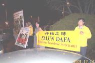 法轮功学员手举呼吁停止镇压的海报,站立在使馆对面。今天的请愿以西方学员为主。更有若干位上了北京天安门广场的西方学员来到使馆前请愿。有两位曾到北京天安门前炼功的西人法轮功学员先后走到中国大使馆门口,和使馆门口的人员交谈,告知他法轮功学员在中国被迫害的真相。