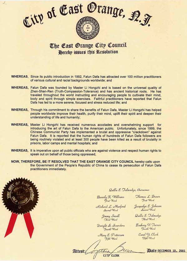 为此,新泽西州东桔市(City of East Orange)议会呼吁中华人民共和国政府立即停止对法轮功学员的迫害。