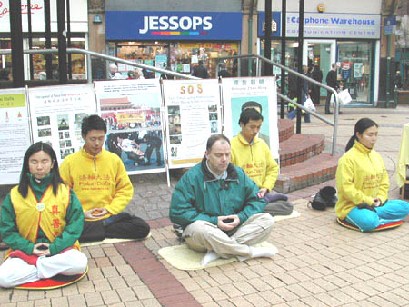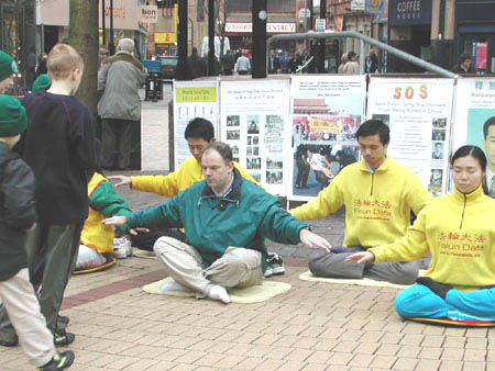 | 闹市炼功,闹中有静 | 行人签名支持大法 | 弟子炼功,孩童观看 |