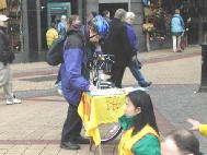 我们在市中心最繁忙的商业区,布置起介绍真象的展板以及“真善忍”的横幅。优美的大法音乐和功法动作吸引了来来往往的行人。炼功、发资料、讲真象、一切井井有条、弟子之间配合协调默契。在离我们不远的地方有一个小亭子,是一个五条街的交叉路口,但是一群其他的人在唱歌搞活动,在他们离去之后,我们就挪到了那儿。