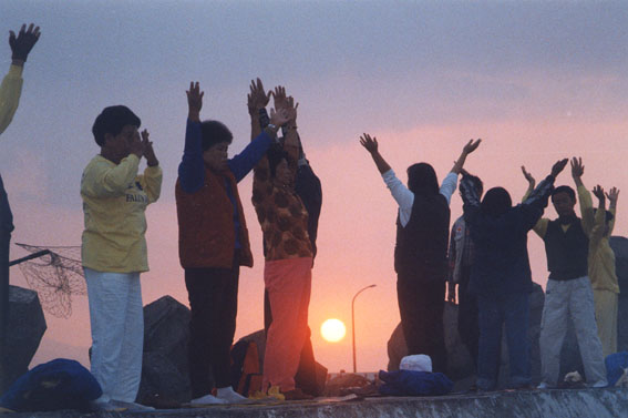 隔日(11月25、周日)清晨黎明前,从4:55~7:05大伙儿在海边防坡堤上参与全球大法弟子同步的三发正念,清除三界内破坏大法的一切邪恶。约第二发正念后,看见圆圆满满大红色晶莹剔透的旭日东升,大家一定都感受到了“佛光普照,礼义圆明”的更深一层涵义。