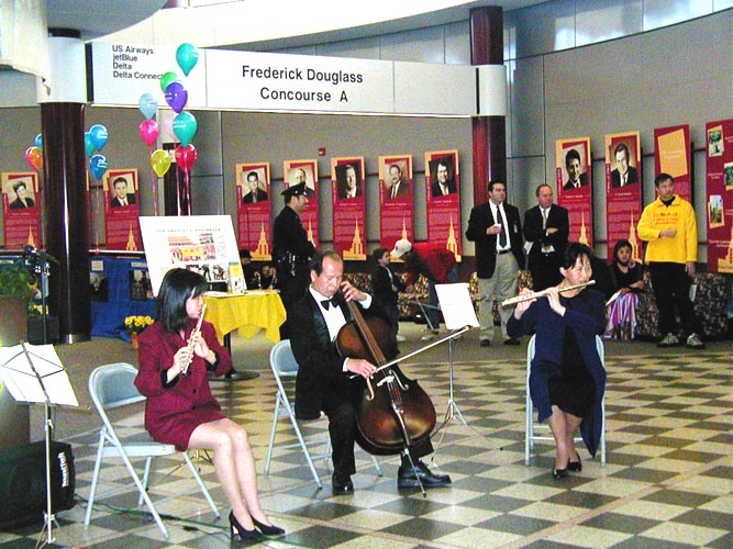 从加拿大多伦多及纽约州其它城市赶来了许多弟子,还有从千里之外的新泽西驱车赶来参加开幕式的一个音乐之家,全家都是大法弟子,父母退休前是国内顶尖乐团成员。深沉的大提琴和悠扬的长笛合奏的一曲“普度”,感动了在场的所有人。随后,一位来自大陆的弟子演唱了一首由大法弟子谱写的《得度》,场面催人泪下。