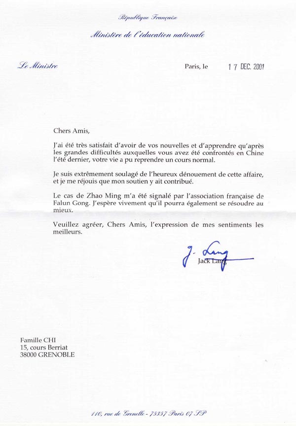 法国法轮功协会已经就赵明的情况引起了我的关注。我非常希望此事能获得最好的解决。
