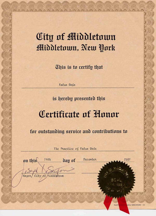 迪斯特法诺(DeStefano)市长签发的荣誉证书全文如下: