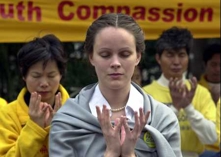 莉莲.斯太芙(Lilian Staf),25岁,一位居住在英国伦敦的瑞典法轮功学员,2001年12月21日星期五在香港和其他修炼者一起打坐。在该精神团体的西方学员因举行了一次法轮功请愿而被中国当局驱逐出境后,其中五位学员星期五在香港举行了抗议,他们说,他们遭到大陆警察的殴打并且身上留有瘀伤。