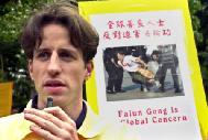 加拿大法轮功学员泽农.多尔奈基站在一块宣传板的一侧,解释板上有他自己上个月在北京被警察带离天安门广场时被拍下的照片。2001年12月21日星期五,泽农在香港和其他修炼者一起打坐后发表了一份声明。多尔奈基是到香港举行抗议的五名西方法轮功成员之一,他指出他们遭到大陆警察的殴打并身上留有瘀伤。