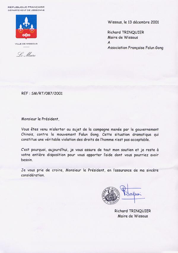 您前来就中国(江泽民)政府操纵的反对法轮功的运动向我示警。这一构成对人权的真正的侵犯的悲剧性局面是不可接受的。