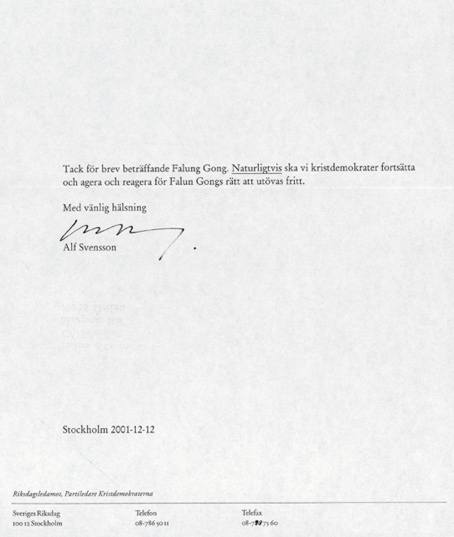 谢谢你给我的关于法轮功的来信。毫无疑问,基督民主党会继续对此作出反应并为法轮功学员能够自由的修炼该功法而继续努力。