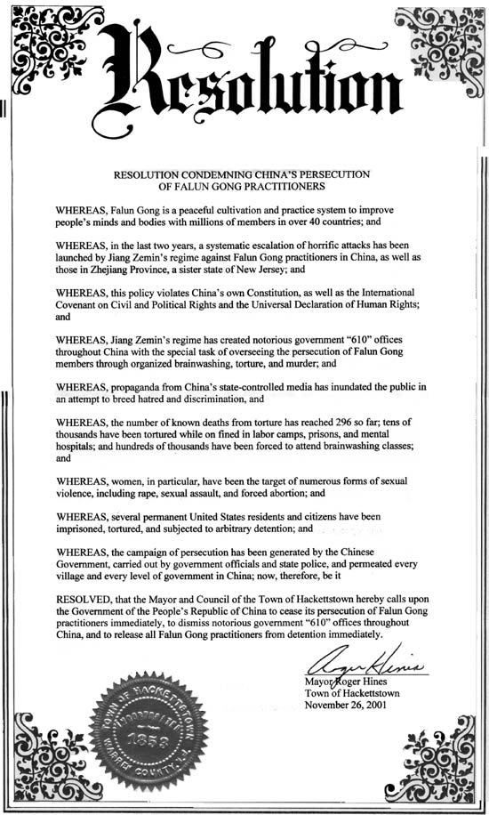 鉴于,在过去的两年中,江泽民政权发动了对中国法轮功学员以及新泽西州的姐妹省-浙江省法轮功学员在内的系统的升级的恐怖迫害;并且