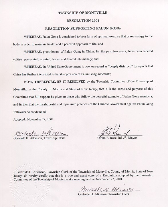 为此,新泽西州摩利丝(Morris)县蒙特维尔(Montville)市市议会决定:全力支持那些以平和的法轮功学员为榜样的人们,谴责中国(江泽民)政府对法轮功学员的残酷迫害和镇压。
