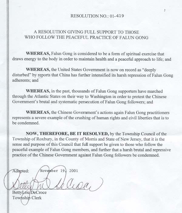 为此,新泽西州摩利丝(Moriss)县罗克斯伯力(Roxbury)市市议会决定:全力支持那些以平和的法轮功学员为榜样的人们,谴责中国(江泽民)政府对法轮功学员的残酷迫害和镇压。